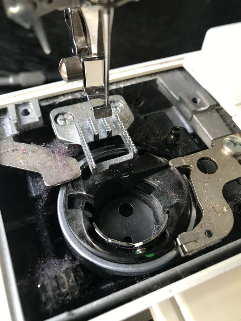 Once the fabric is free, I grab my Sewing Machine Cleaning Brush and sweep away lint, debris, or any stray bad vibes lurking in my machine. Additionally, I look closely for any loose thread pieces around the bobbin case or feed dogs, as they can easily cause future jams if left behind.