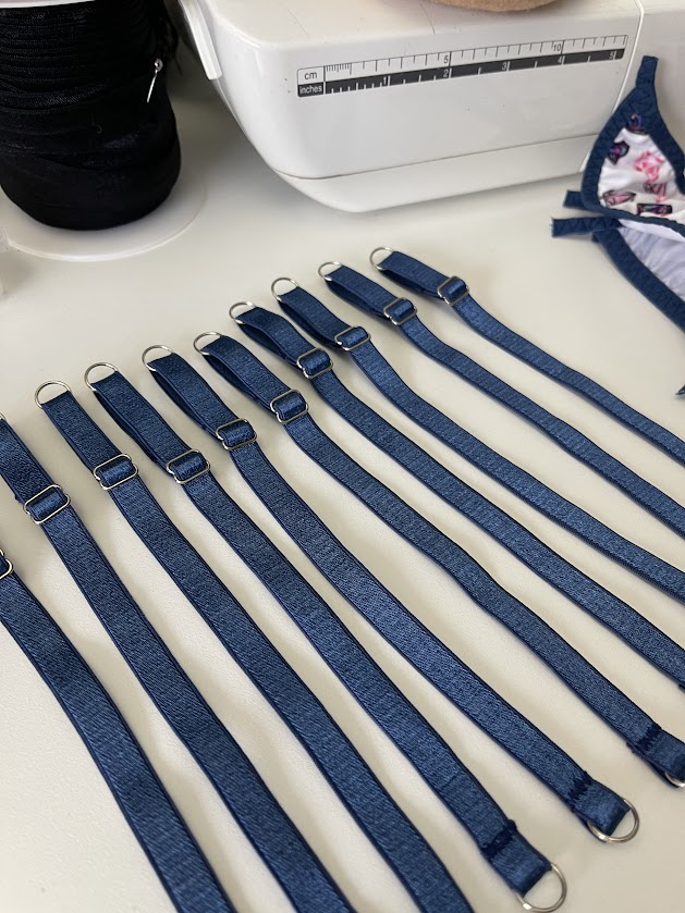 You’ll need 10 pieces if you’re sewing five pairs (two per panty). Slide a slider onto each elastic, fold it, and sew the fold near the slider to secure it.