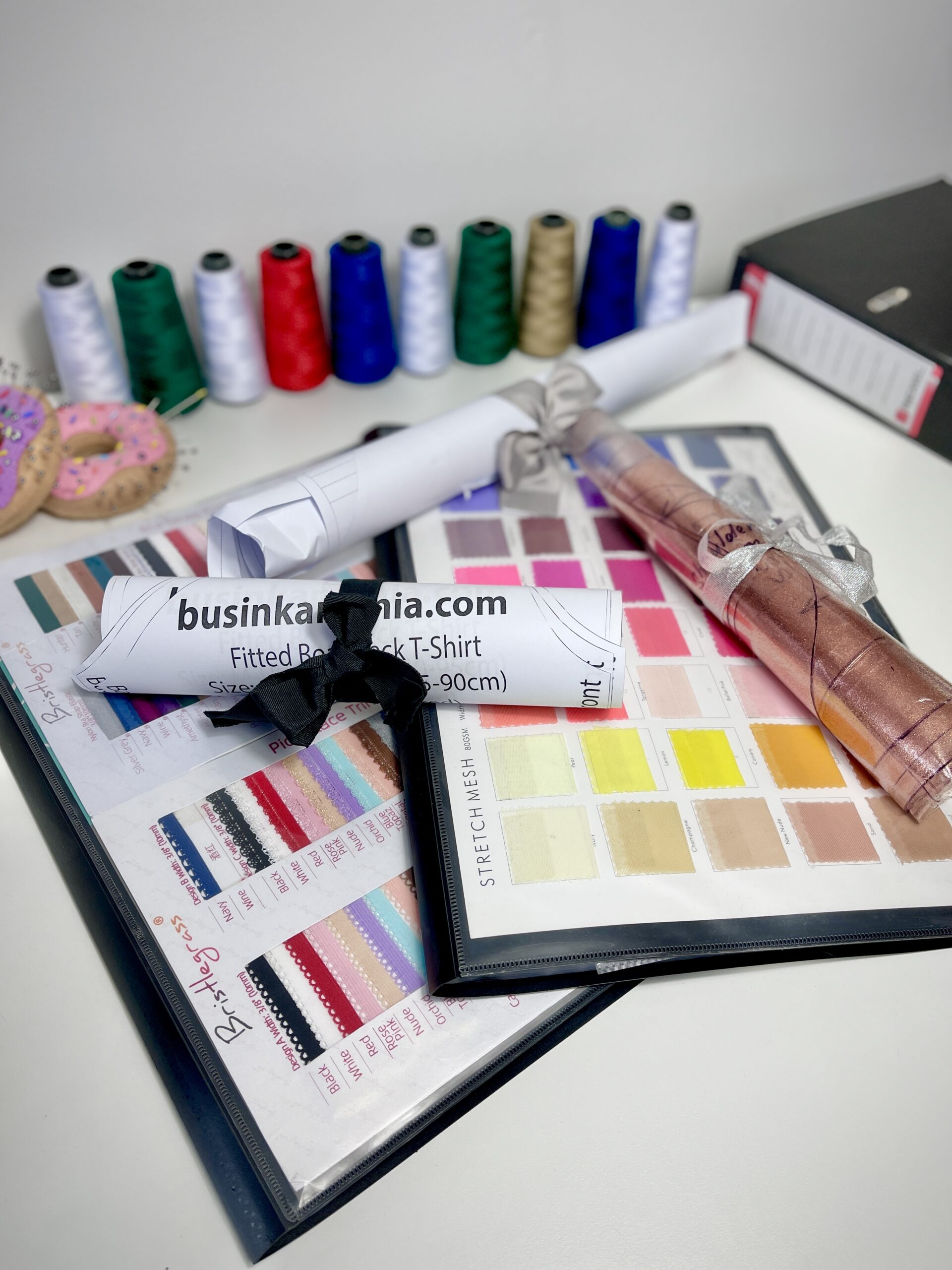 Rolling your sewing patterns with fabric strips adds a dash of charm to functionality.